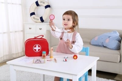 Ένα βαλιτσάκι γιατρού σε κόκκινο χρώμα με όλα τα ξύλινα απαραίτητα αξεσουάρ του γιατρού που βοηθάει στην καλλιέργεια της φαντασίας του παιδιού και προσφέρει αμέτρητες ώρες παιχνιδιού και διασκέδασης.