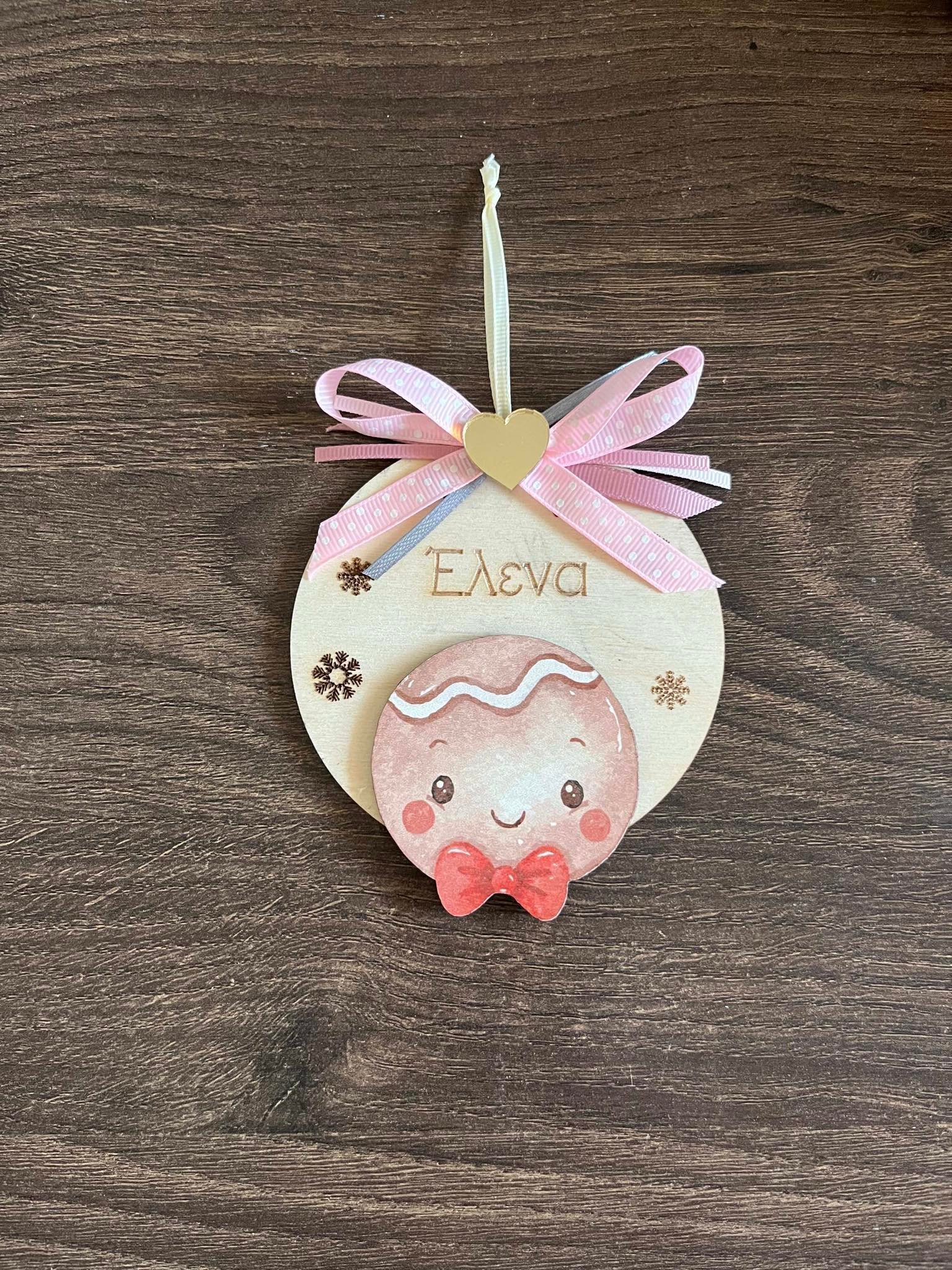 Ξύλινο στολίδι 10cm με χάραξη ονόματος και χρονολογίας καθώς επίσης και τις αντίστοιχες φιγούρες με πουά κορδέλα.