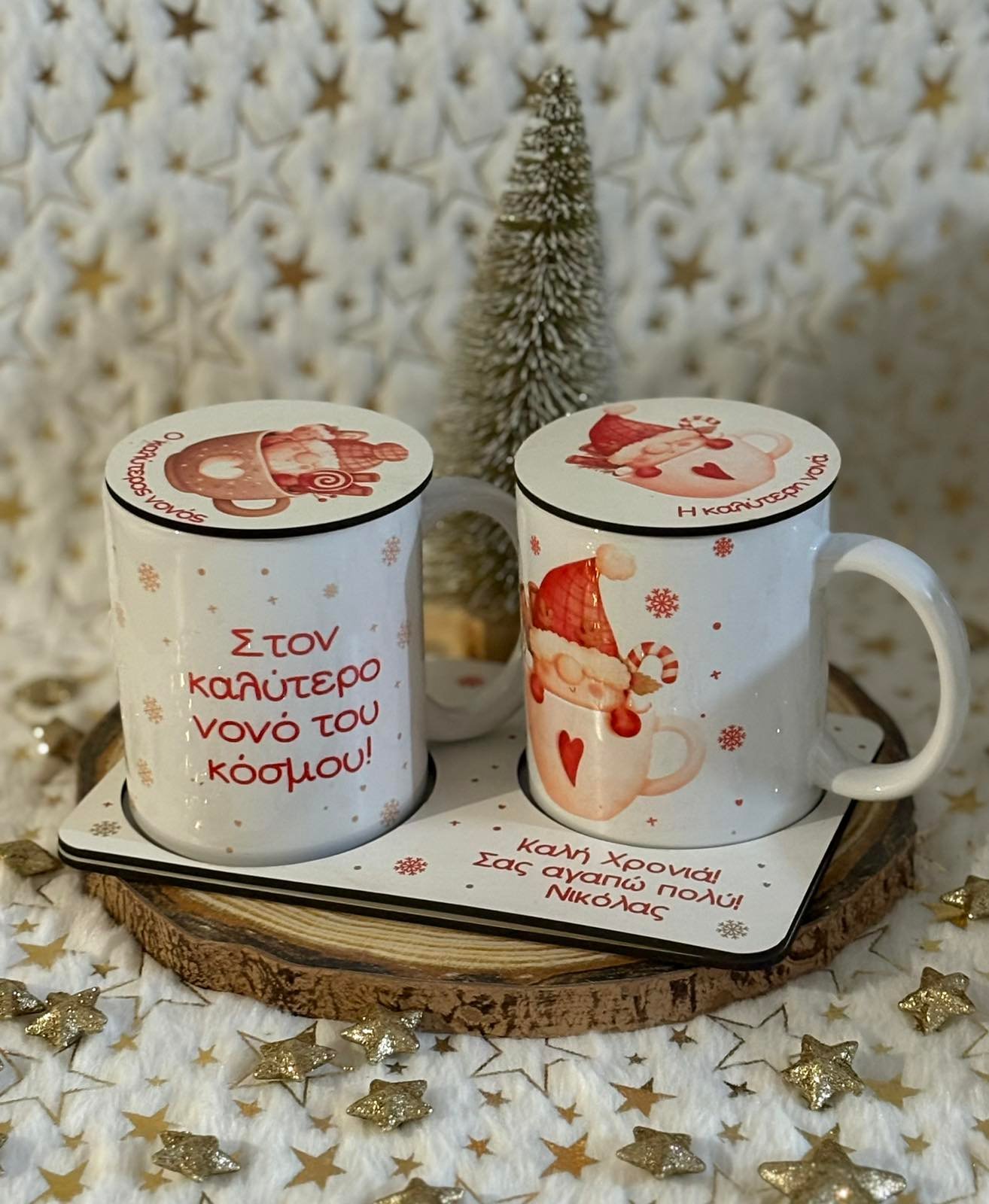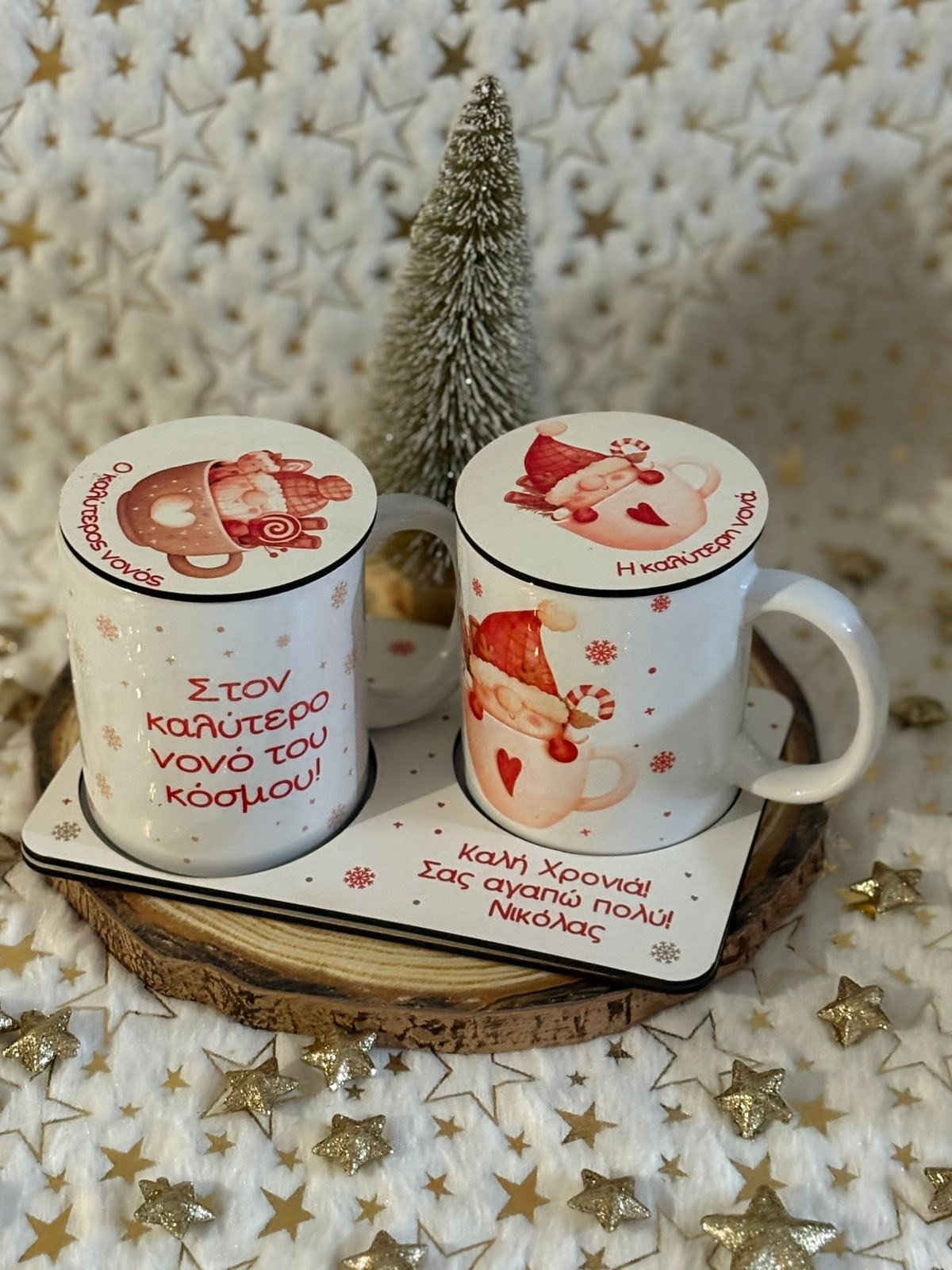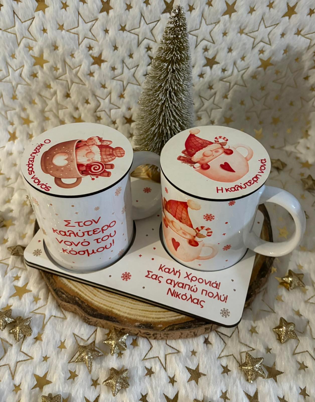 Σετ δώρου 2 κούπες, 2 σουβέρ και ένα δισκάκι για τον νονό και την νονά.